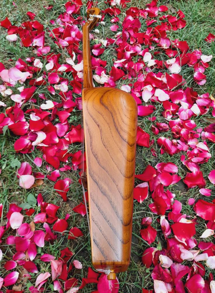 The wood for the both front and rear plate is made from carefully selected Georgian Larch and Lime. It is selected for its vibrant and bold flame. The ribs and scroll are similar to the back. Instrument is